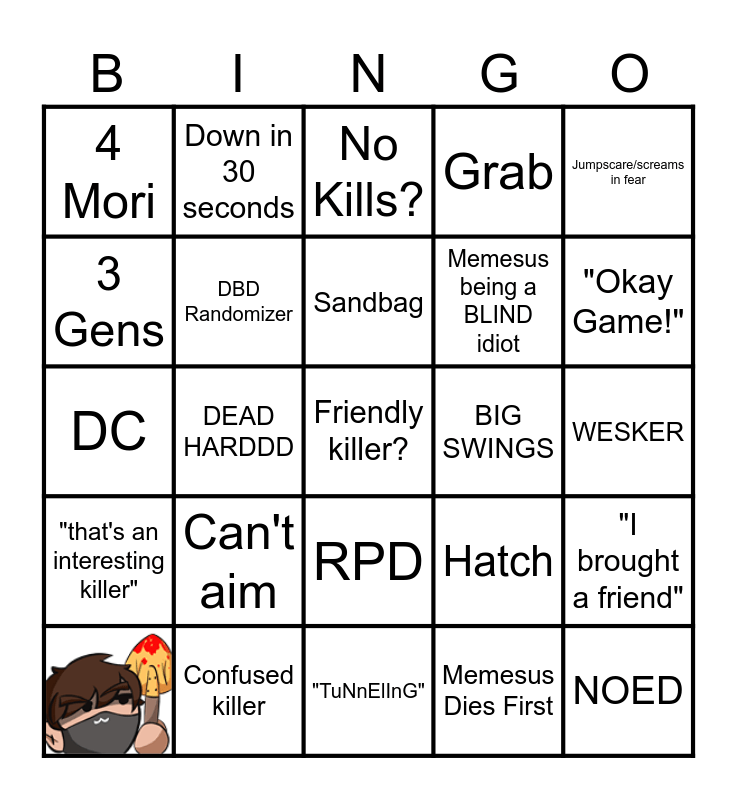 This bingo card has 1 images and 28 words: Blast mine, DEAD HARDDD, NOED, 4 Mori, No Kills?, DBD Randomizer, Can't aim, BIG SWINGS, Confused killer, WESKER, Friendly killer?, "TuNnElInG", Memesus Dies First, "Okay Game!", Flashlight/Stun save, RPD, "that's an interesting killer", Jumpscare/screams in fear, DC, Hatch, Memesus Sings like a dumbass, Memesus being a BLIND idiot, 3 Gens, Grab, Down in 30 seconds, "I brought a friend", Sandbag and "OUT THE WAY!".