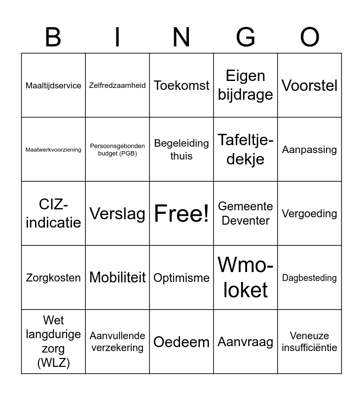 This bingo card has a free space and 50 words: Diabetes type 2, Veneuze insufficiëntie, Diabetische voet, Oedeem, Mobiliteit, Wet maatschappelijke ondersteuning (WMO), Zelfredzaamheid, Inclusieve samenleving, Maatwerkvoorziening, Spoedgevallen, Persoonsgebonden budget (PGB), Eigen bijdrage, Dagbesteding, Wmo-loket, Sociale wijkteams, Huishoudelijke hulp, Begeleiding thuis, Gemeente Deventer, Mantelzorger, Voorstel, Verslag, Aanvraag, Maaltijdservice, Tafeltje-dekje, Douche-zitruimte, Huis van de wijk, Aanpassing, Krukje, Toekomst, Optimisme, Zorgverzekeringswet, Zorgtoeslag, Eigen risico, Basisverzekering, Aanvullende verzekering, Premie, Zorgpremie, Eigen bijdrage, Polis, Vergoeding, Zorgaanbieder, Wijkverpleging, Mantelzorgwoning, Persoonsgebonden budget (PGB), Wet langdurige zorg (WLZ), CIZ-indicatie, Zorgkantoor, Zorginstelling, Zorgkosten and Zorgplafond.
