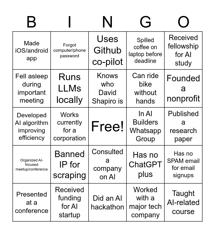 This bingo card has a free space and 29 words: Presented at a conference, Contributed to open-source project, Works currently for a corporation, Attended a chatGPT workshop, Made iOS/android app, Uses Github co-pilot, Runs LLMs locally, Banned IP for scraping, In AI Builders Whatsapp Group, Received funding for AI startup, Published a research paper, Taught AI-related course, Did an AI hackathon, Worked with a major tech company, Founded a nonprofit, Developed widely adopted software, Consulted a company on AI, Organized AI-focused meetup/conference, Received fellowship for AI study, Developed AI algorithm improving efficiency, Has no ChatGPT plus, Thinks AI will destroy humanity, Can ride bike without hands, Fell asleep during important meeting, Spilled coffee on laptop before deadline, Forgot computer/phone password, Has no SPAM email for email signups, Knows who David Shapiro is and Has posted something in Hacker News.