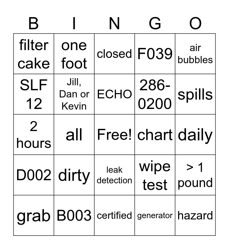 This bingo card has a free space and 25 words: dirty, certified, ECHO, grab, air bubbles, filter cake, SLF 12, one foot, chart, leak detection, 286-0200, 2 hours, wipe test, > 1 pound, Jill, Dan or Kevin, EWO, daily, closed, spills, all, hazard, B003, D002, F039 and generator.