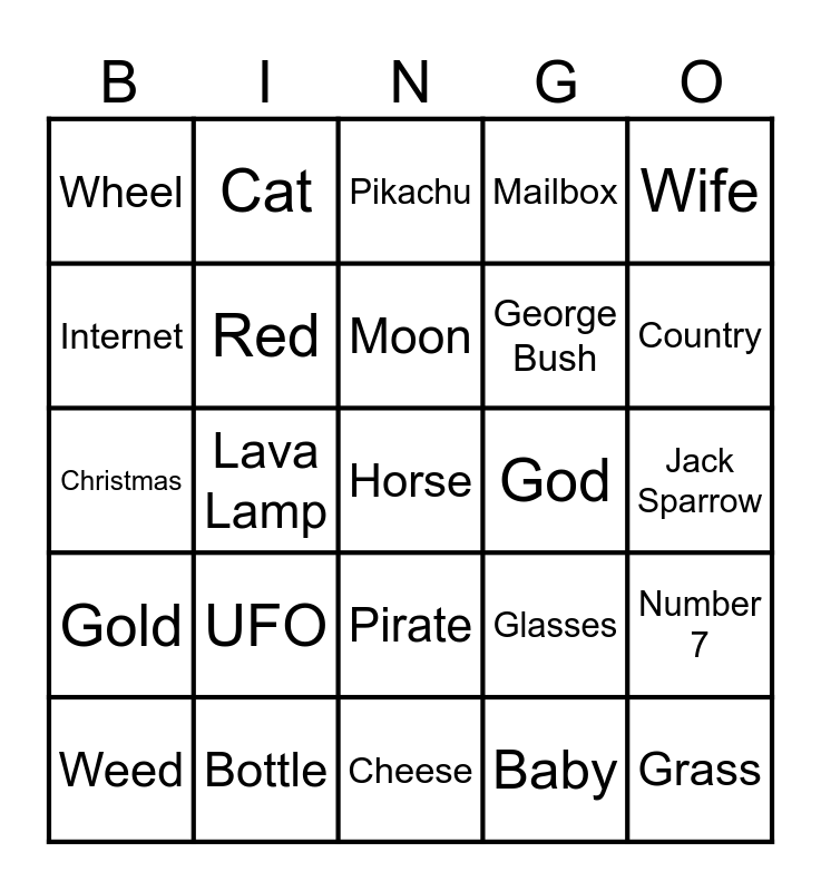 This bingo card has a free space and 24 words: UFO, Bottle, Moon, Weed, Wife, Wheel, Internet, Cat, God, Pirate, George Bush, Christmas, Glasses, Number 7, Red, Baby, Jack Sparrow, Pikachu, Country, Lava Lamp, Grass, Gold, Mailbox and Cheese.