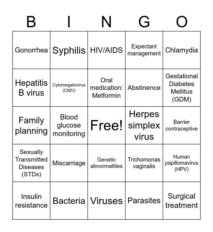 This bingo card has a free space and 25 words: Sexually Transmitted Diseases (STDs), Bacteria, Viruses, Parasites, Chlamydia, Gonorrhea, Syphilis, HIV/AIDS, Herpes simplex virus, Human papillomavirus (HPV), Hepatitis B virus, Cytomegalovirus (CMV), Zika, Trichomonas vaginalis, Gestational Diabetes Mellitus (GDM), Insulin resistance, Blood glucose monitoring, Oral medication: Metformin, Abstinence, Barrier contraceptive, Family planning, Miscarriage, Genetic abnormalities, Expectant management and Surgical treatment.