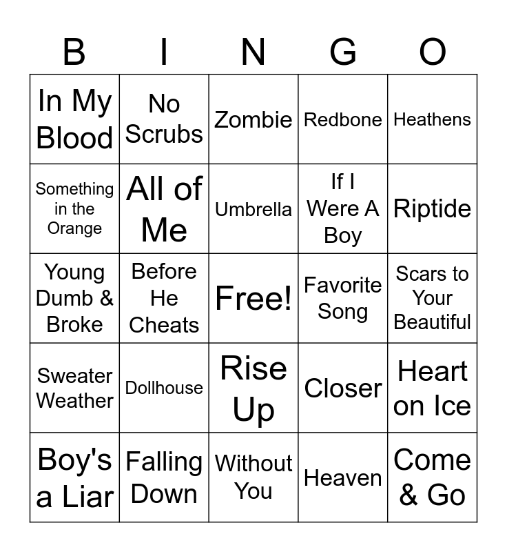 This bingo card has a free space and 24 words: Dollhouse, Falling Down, Umbrella, Boy's a Liar, Heathens, In My Blood, Something in the Orange, No Scrubs, Favorite Song, Rise Up, If I Were A Boy, Young Dumb & Broke, Closer, Heart on Ice, All of Me, Heaven, Scars to Your Beautiful, Zombie, Riptide, Before He Cheats, Come & Go, Sweater Weather, Redbone and Without You.