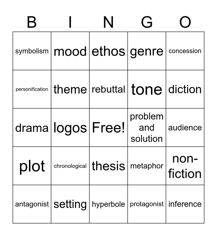 This bingo card has a free space and 39 words: FANBOY, flashback, climax, theme, antagonist, thesis, rebuttal, counterclaim, concession, plot, logos, genre, inference, audience, problem and solution, chronological, logical fallacy, symbolism, simile, metaphor, personification, hyperbole, tone, diction, emphasize, convey, similarity, difference, characterization, mood, author's purpose, conflict, ethos, setting, protagonist, pathos, non-fiction, drama and cause and effect.
