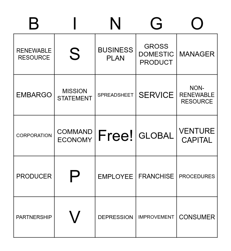 This bingo card has a free space and 24 words: P, V, SPREADSHEET, PARTNERSHIP, MANAGER, RENEWABLE RESOURCE, EMBARGO, S, GLOBAL, EMPLOYEE, SERVICE, CORPORATION, FRANCHISE, PROCEDURES, MISSION STATEMENT, IMPROVEMENT, VENTURE CAPITAL, BUSINESS PLAN, NON-RENEWABLE RESOURCE, COMMAND ECONOMY, CONSUMER, PRODUCER, GROSS DOMESTIC PRODUCT and DEPRESSION.