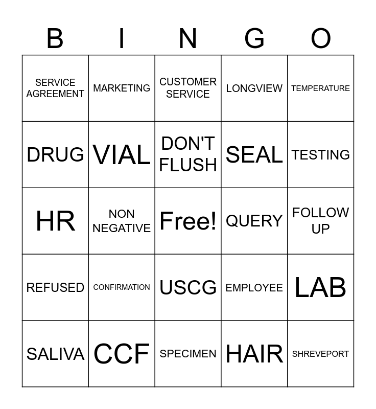 This bingo card has a free space and 74 words: DOT, UA, CUSTOMER SERVICE, ACCOUNTING, COLLECTIONS, FMCSA, REPORTING, POCT, SALIVA, DNA, BACKGROUNDS, DONOR, DON'T FLUSH, DRUG, ALCOHOL, NON NEGATIVE, POSITIVE, TESTING, IT, HR, VIAL, MARKETING, LONGVIEW, TYLER, SHREVEPORT, WICHITA FALLS, CONNIE, ON SITE, TOILET HUMOR, SAMPLE, TEMPERATURE, CUP, DATCS, EMAIL, NAIL, HAIR, MRO, BAT, VERIFY, SPLIT, SPECIMEN, CCF, CONSORTIUM, RANDOM, CLEARING HOUSE, SERVICE AGREEMENT, SCAN, CONFIRMATION, SWAB, SPEC ID, DRUG FREE, OBSERVED, FOLLOW UP, DER, PHMSA, FAA, USCG, FTA, FRA, LAB, SEAL, INSTANT, REFUSED, SHY BLADDER, QUERY, PRE ACCESS, RETURN TO DUTY, SPREADSHEET, EMPLOYEE, AUDIT, ORIENTATION, STATISTICAL DATA, DRIVERS and OPERATORS.