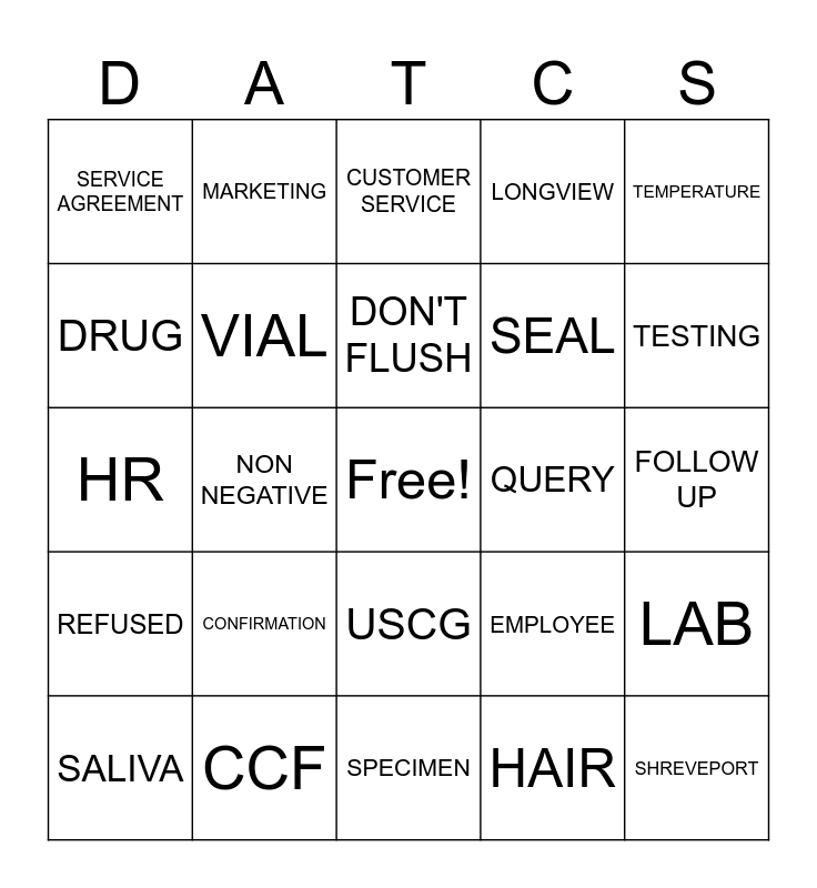 This bingo card has a free space and 74 words: DOT, UA, CUSTOMER SERVICE, ACCOUNTING, COLLECTIONS, FMCSA, REPORTING, POCT, SALIVA, DNA, BACKGROUNDS, DONOR, DON'T FLUSH, DRUG, ALCOHOL, NON NEGATIVE, POSITIVE, TESTING, IT, HR, VIAL, MARKETING, LONGVIEW, TYLER, SHREVEPORT, WICHITA FALLS, CONNIE, ON SITE, TOILET HUMOR, SAMPLE, TEMPERATURE, CUP, DATCS, EMAIL, NAIL, HAIR, MRO, BAT, VERIFY, SPLIT, SPECIMEN, CCF, CONSORTIUM, RANDOM, CLEARING HOUSE, SERVICE AGREEMENT, SCAN, CONFIRMATION, SWAB, SPEC ID, DRUG FREE, OBSERVED, FOLLOW UP, DER, PHMSA, FAA, USCG, FTA, FRA, LAB, SEAL, INSTANT, REFUSED, SHY BLADDER, QUERY, PRE ACCESS, RETURN TO DUTY, SPREADSHEET, EMPLOYEE, AUDIT, ORIENTATION, STATISTICAL DATA, DRIVERS and OPERATORS.