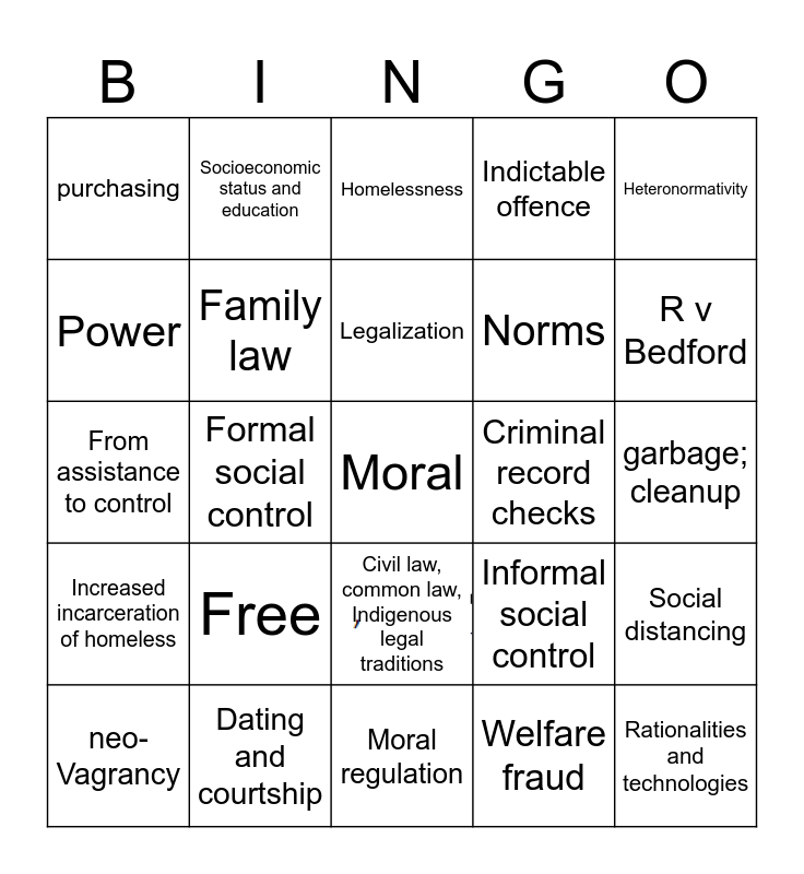 This bingo card has 1 images and 25 words: Free, Moral regulation, Legalization, neo-Vagrancy, Heteronormativity, purchasing, Power, Socioeconomic status and education, Criminal record checks, Civil law, common law, Indigenous legal traditions, Norms, From assistance to control, Informal social control, Social distancing, Family law, Rationalities and technologies, garbage; cleanup, Homelessness, R v Bedford, Formal social control, Moral, Dating and courtship, Increased incarceration of homeless, Indictable offence and Welfare fraud.