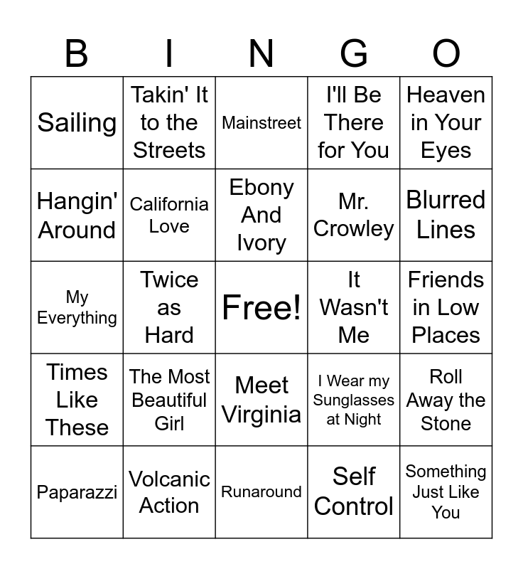 This bingo card has a free space and 56 words: Absolutely, Paparazzi, Lola, Sailing, Runaround, What's Your Name, California Love, The Rubberband Man, Mr. Crowley, Run Through the Jungle, I'll Be There for You, Like a Prayer, You Never Can Tell, Bad Habits, Space Oddity, Blank Space (Taylor's Version), Heaven in Your Eyes, Twice as Hard, Girlfriend, Something Just Like You, It Wasn't Me, Beverly Hills, I Wear my Sunglasses at Night, Mainstreet, Sad But True, Ebony And Ivory, Pickup Man, Stayin Alive, Blurred Lines, Shadow Dancing, I’m on Fire, Blowin' in the Wind, Unstoppable, Time Stands Still, Friends in Low Places, Hangin' Around, My Everything, Fight Fire with Fire, Times Like These, Takin' It to the Streets, Meet Virginia, A Rose by Any Name, Jump Around, Watermelon Sugar, Rainbow in the Dark, The Most Beautiful Girl, Volcanic Action, If I Let You Go, Stacy's Mom, Don't You Want Me, Self Control, Hungry Eyes, Good Thing, Bad Karma, Roll Away the Stone and She's in Love with the Boy.