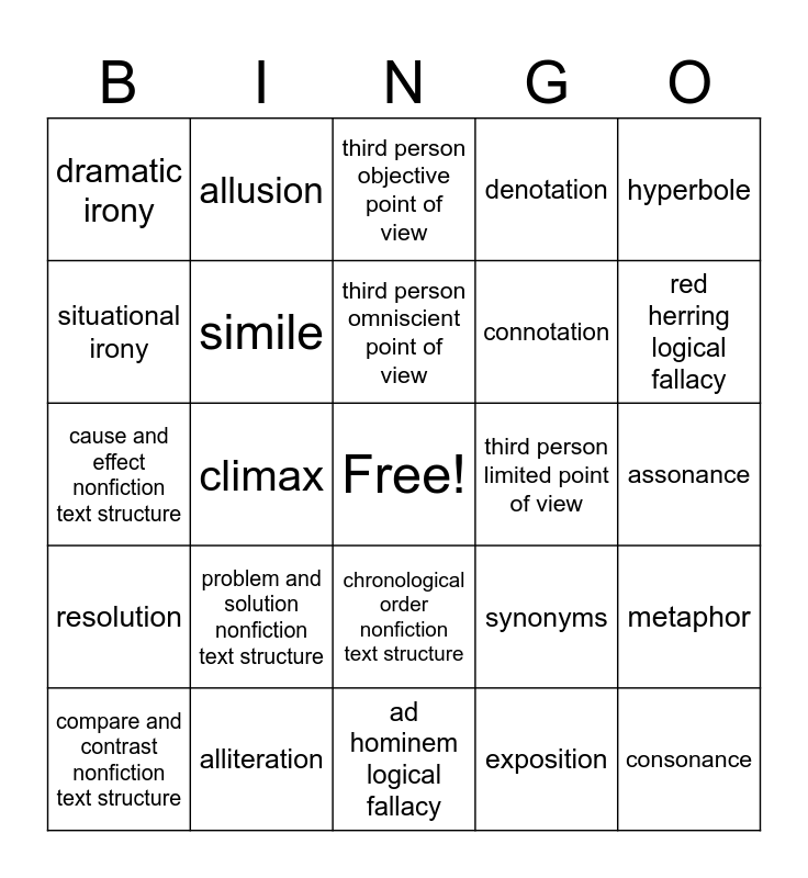 This bingo card has a free space and 32 words: exposition, rising action, climax, falling action, resolution, simile, hyperbole, metaphor, allusion, personification, third person omniscient point of view, third person objective point of view, second person point of view, first person point of view, third person limited point of view, symbolism, compare and contrast nonfiction text structure, cause and effect nonfiction text structure, chronological order nonfiction text structure, problem and solution nonfiction text structure, synonyms, antonyms, assonance, alliteration, consonance, denotation, connotation, situational irony, dramatic irony, ad hominem logical fallacy, slippery slope logical fallacy and red herring logical fallacy.