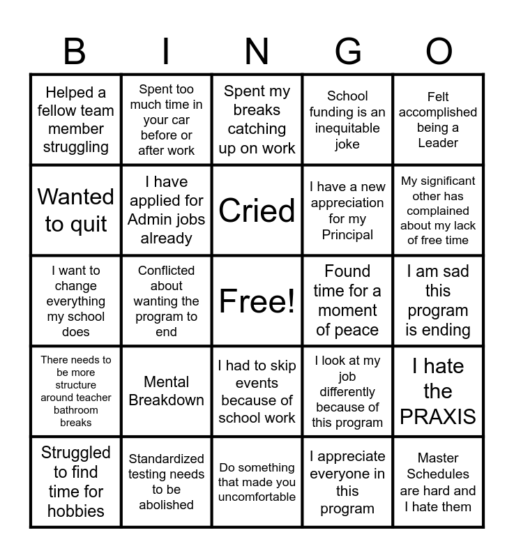This bingo card has a free space and 25 words: Mental Breakdown, Do something that made you uncomfortable, Cried, Struggled to find time for hobbies, Felt accomplished being a Leader, Helped a fellow team member struggling, Wanted to quit, Spent too much time in your car before or after work, Found time for a moment of peace, I had to skip events because of school work, I have a new appreciation for my Principal, I want to change everything my school does, I look at my job differently because of this program, I hate the PRAXIS, I have applied for Admin jobs already, I learned I do not want to be a principal (yet), I am sad this program is ending, Spent my breaks catching up on work, My significant other has complained about my lack of free time, Conflicted about wanting the program to end, Master Schedules are hard and I hate them, Standardized testing needs to be abolished, There needs to be more structure around teacher bathroom breaks, School funding is an inequitable joke and I appreciate everyone in this program.