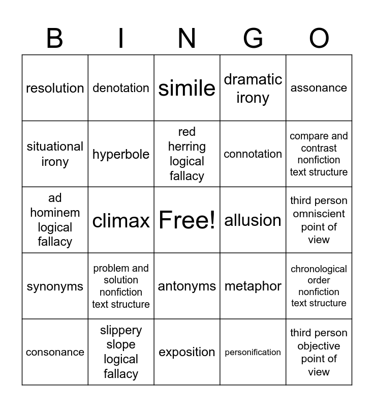 This bingo card has a free space and 31 words: exposition, rising action, climax, falling action, resolution, simile, hyperbole, metaphor, allusion, personification, third person omniscient point of view, third person objective point of view, third person limited point of view, symbolism, compare and contrast nonfiction text structure, cause and effect nonfiction text structure, chronological order nonfiction text structure, problem and solution nonfiction text structure, synonyms, antonyms, assonance, alliteration, consonance, denotation, connotation, situational irony, dramatic irony, ad hominem logical fallacy, slippery slope logical fallacy, red herring logical fallacy and verbal irony.