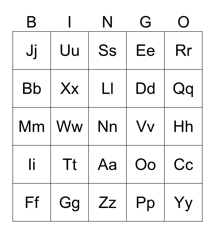 This bingo card has 26 words: Aa, Pp, Ll, Gg, Rr, Jj, Bb, Uu, Hh, Oo, Dd, Mm, Cc, Ff, Ww, Kk, Ee, Ii, Ss, Nn, Qq, Zz, Vv, Tt, Xx and Yy.