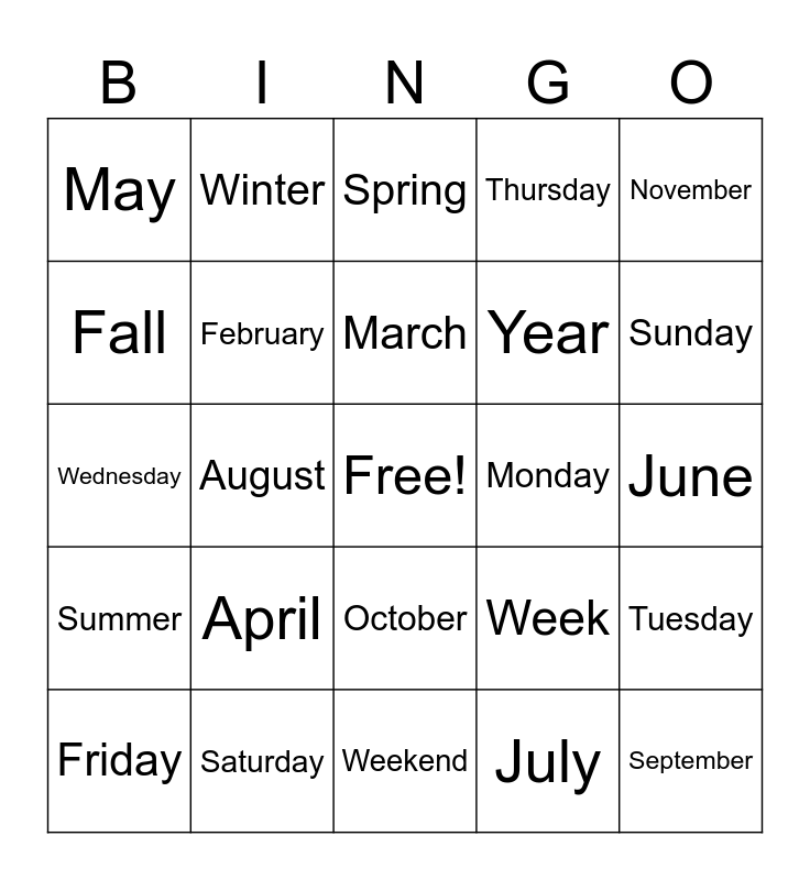 This bingo card has a free space and 27 words: Week, Month, Year, Weekend, Fall, Spring, Winter, Summer, Monday, Tuesday, Wednesday, Thursday, Friday, Saturday, Sunday, January, February, March, April, May, June, July, August, September, October, November and December.