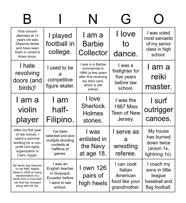 This bingo card has 68 words: Free!, I love Sherlock Holmes stories., I like to roller skate, Recently hit the game-winning shot in a double overtime basketball game., Went skydiving once and only once!, Played in rock band while in college., I played football in college., My spouse and I drive a Tesla and a Suburban because one saves on carbon emissions and fuel costs, which feels socially and economically responsible, while the other is just like driving a sofa, which feels awesome., I was in a Barbie commercial in 1989 (a few years after first receiving my SAG card, which is still active), I ran for the Board of Supervisors in San Francisco. I didn't win--but I learned a great deal about many things., I was enlisted in the Navy at age 18., I published a scientific paper on the behavior of excited electrons in the Earth's magnetic field., I surf outrigger canoes., I was voted most sarcastic of my senior class in high school., I was the editor of my college's student newspaper., I hate revolving doors (and birds)!, I am half-Filipino., First concert attended at 13 years old was Depeche Mode and have seen them in conert 6 times since., I ran a marathon in Death Valley., I've been selected and won multiple shooting contests at halftime of games., I was a firefighter for five years before law school., I serve as a wrestling referee., After my first year of law school, I spent a summer working for a non-profit civil rights organization in Cairo, Egypt., I coach my sons in little league baseball and flag football., Sometimes I use a fun font, like Baguet Script, to type drafts of briefs, memos, and letters, just to mix it up, and then switch to Times New Roman before saving or sending., I've run 7 marathons, I am a twin, I am conversational in Brazilian Portuguese., My house has burned down twice (arson 1x, lightning 1x)., I was captain of UPenn's Division I college gymnastics team., I am a Barbie Collector, My wife is a real rocket scientist. (True story.), As an adolescent, I was a member of a breakdancing group., I have been a grave digger and a garbage man in past jobs, I love to dance., One fun fact is that I'm a life long artist, and have had my art featured on merchandise by various well known companies, including a Volcom tee shirt, TOMS shoes, multiple surf boards, and more., I climbed Kilimanjaro, My family was featured on the NBC Nightly News in 2004 as being representative of a family from a "rust belt" city that has changed along with the city., I am a reiki master., I am a violin player, I once avoided a DUI at a traffic stop by reciting the Greek alphabet from A - Z., I have been run over by a tornado., I used to be a competitive figure skater., I was born in Santiago, Chile., I have two corgis and if this whole law thing doesn't work out, my backup plan is to open a brunch-centered corgi cafe with a liquor license., I used to be a hooker - the rugby position that is! I played men's club rugby for years before one too many black eyes on Monday morning ended my career!, I was struck by a foul ball hit by Bobby Bonilla while on the field during batting practice at Shea Stadium in summer 1993., I have lactophobia -- a fear of milk. I am fine with ice cream and cheese, but I despise milk., I was the 1987 Miss Teen of New Jersey., I was an English teacher in Guayquil, Ecuador before I went to law school., Recently cast as the understudy for the principal male role in a regional theater's production of the musical "Fun Home!", Was a professional boxer., I was born in Tokyo, Japan., I own 126 pairs of high heels, I keep on hand Carolina Reaper peppers in my kitchen for cooking., I've served as the officiant at three weddings., I can cook Italian American food like your grandmother., Saved my neighbor's life when he was attacked by his two pit bulls, I have had dinner with Katy Perry and Orlando Bloom at their home., I have climbed Mt. Kilimanjaro, I once held up Bruce Springsteen as he crowd surfed at a concert in Philadelphia., My wife and I named our dog "Bodhi" after Patrick Swayze's character in Point Break., I escorted Andrei Gromyko, Soviet Foreign Minister, on his flight to visit the United Nations in 1979., Captain of the college cheerleading squad, I know how to count cards in blackjack and can teach you!, My first job was on a farm, The Secret Service once investigated me to see if I was Carlos, the Jackal. and I am admitted to practice law in New Zealand.