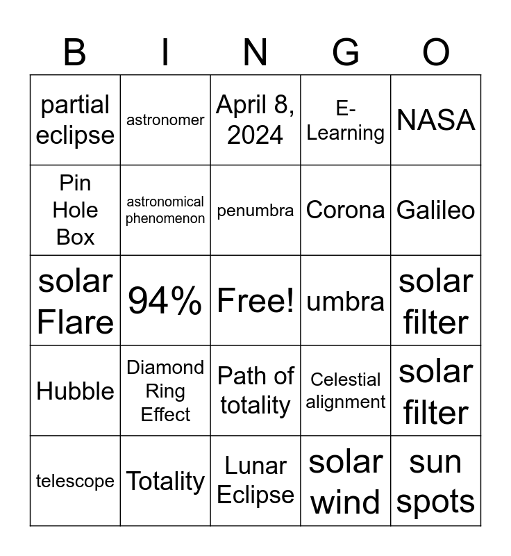 This bingo card has a free space and 24 words: Diamond Ring Effect, Totality, penumbra, telescope, NASA, partial eclipse, Pin Hole Box, astronomer, umbra, Path of totality, Corona, solar Flare, Celestial alignment, solar filter, astronomical phenomenon, solar wind, solar filter, April 8, 2024, Galileo, 94%, sun spots, Hubble, E-Learning and Lunar Eclipse.
