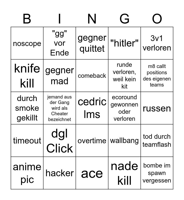 This bingo card has a free space and 24 words: dgl Click, hacker, comeback, anime pic, 3v1 verloren, noscope, knife kill, "gg" vor Ende, ecoround gewonnen oder verloren, overtime, runde verloren, weil kein kit, durch smoke gekillt, wallbang, tod durch teamflash, gegner mad, nade kill, russen, gegner quittet, m8 callt positions des eigenen teams, jemand aus der Gang wird als Cheater bezeichnet, bombe im spawn vergessen, timeout, "hitler" and ace.