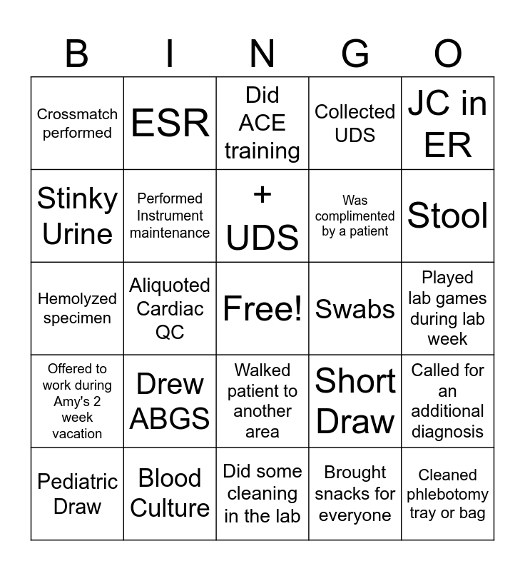 This bingo card has a free space and 24 words: Drew ABGS, Blood Culture, + UDS, Pediatric Draw, JC in ER, Crossmatch performed, Stinky Urine, ESR, Swabs, Walked patient to another area, Was complimented by a patient, Hemolyzed specimen, Short Draw, Called for an additional diagnosis, Performed Instrument maintenance, Brought snacks for everyone, Played lab games during lab week, Did ACE training, Stool, Aliquoted Cardiac QC, Cleaned phlebotomy tray or bag, Offered to work during Amy's 2 week vacation, Collected UDS and Did some cleaning in the lab.