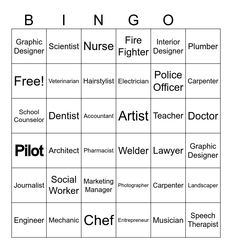 This bingo card has 36 words: Pilot, Architect, Chef, Electrician, Teacher, Doctor, Graphic Designer, Mechanic, Nurse, Photographer, Police Officer, Plumber, Journalist, Dentist, Hairstylist, Fire Fighter, Carpenter, Graphic Designer, Free!, Veterinarian, Pharmacist, Welder, Lawyer, Landscaper, School Counselor, Scientist, Accountant, Entrepreneur, Interior Designer, Carpenter, Engineer, Social Worker, Marketing Manager, Artist, Musician and Speech Therapist.