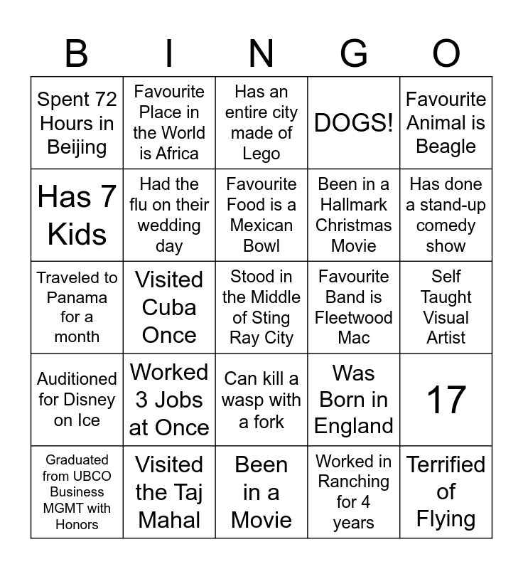 This bingo card has 48 words: Used to Farm and Own Cattle, Stood in the Middle of Sting Ray City, Does NOT eat raw fish, Been in a Movie, Worked 3 Jobs at Once, Has 5 Sisters, Favourite Place in the World is Africa, Favourite Sport is Soccer, Has 7 Kids, Name is ALWAYS spelt incorrectly, Had the flu on their wedding day, DOGS!, 17, Was Born in England, Plays Guitar, Has a Dog Named Gronk, Favourite Food is a Mexican Bowl, Favourite Band is Fleetwood Mac, Favourite animal is an owl, Favourite Animal is Beagle, Visited Cuba Once, Worked in Ranching for 4 years, Spent 72 Hours in Beijing, Been in a Hallmark Christmas Movie, Dislocated 6 different Joints, Has done a stand-up comedy show, Graduated from UBCO Business MGMT with Honors, Has completed a 72 hour fast, Can kill a wasp with a fork, Auditioned for Disney on Ice, Got Married in Barbados, Future Hotdog stand owner, Obsessed with Pugs, Would Kill at Friends Trivia, Visited the Taj Mahal, Has eaten Barnacles, It's my Birthday!!, Self Taught Visual Artist, Spent their wedding night trapped on a gondola, Have been published in a book, Dog is named after a cartoon cat, Terrified of Flying, Has an entire city made of Lego, Lost 100 lbs, Traveled to Panama for a month, Painted Sportsfields for a Summer, 40 and Munich.