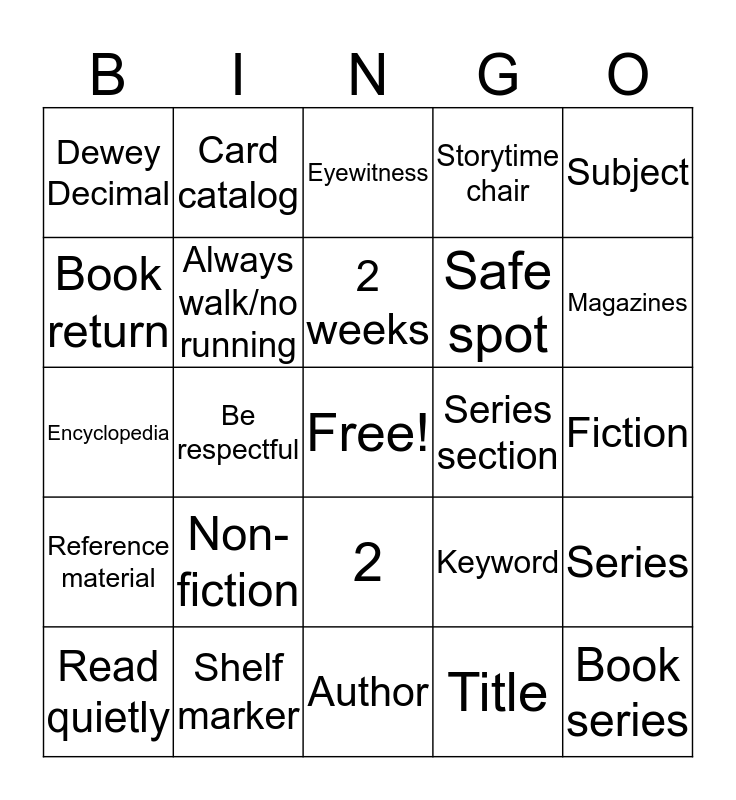 This bingo card has a free space and 24 words: Non-fiction, Shelf marker, 2 weeks, Read quietly, Subject, Dewey Decimal, Book return, Card catalog, Series section, 2, Safe spot, Encyclopedia, Keyword, Series, Always walk/no running, Title, Fiction, Eyewitness, Magazines, Be respectful, Book series, Reference material, Storytime chair and Author.