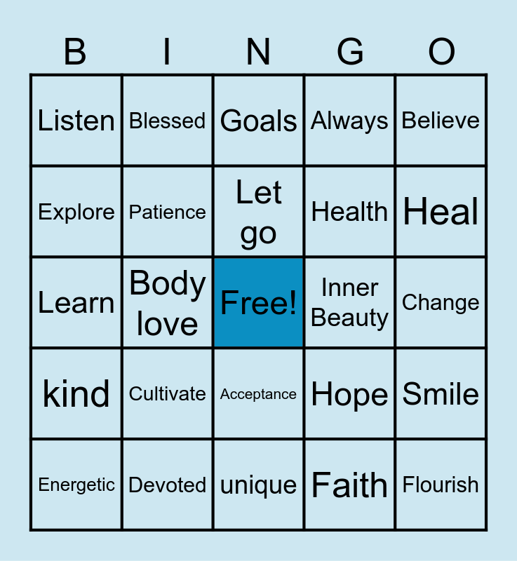 This bingo card has a free space and 28 words: Smile, Oriented, Health, Faith, Explore, Goals, Blessed, kind, Inner Beauty, Energetic, Learn, Always, Devoted, unique, Heal, Shine, Cultivate, Patience, Let go, Acceptance, Listen, Grow, Flourish, Body love, Change, Hope, Believe and Devote.