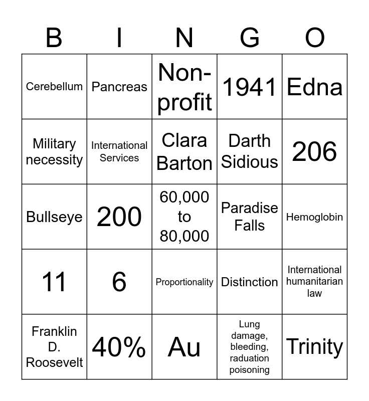 This bingo card has a free space and 61 words: New Mexico, 40%, Trauma, anxiety, depression, 11, Lung damage, bleeding, raduation poisoning, @nbhv.ihl, International Services, Naboo, Darth Sidious, Brasilia, 1941, James Madison, Military necessity, The hand, The Manhattan Project, Cerebellum, Trinity, Edna, Blood services, Clara Barton, Paradise Falls, Non-profit, Franklin D. Roosevelt, International humanitarian law, Civilian, Leg, Aglet, Gallbladder, 206, Veteran, The Service to Armed Forces, Combatant, Cones, Vibranium, Pancreas, WALL-E, Tatooine, 200, Kidney, Bullseye, 1945, 6, Hemoglobin, Disaster services, Distinction, November, Epidermis, August 9th, Pythagorean theorem, Proportionality, Au, May, The Heart of the Valley Humanitarians, Ulna, Humanity, 60,000 to 80,000, The Rock, 344, 000, AB negative, Rubella, mumps, measles and 4.