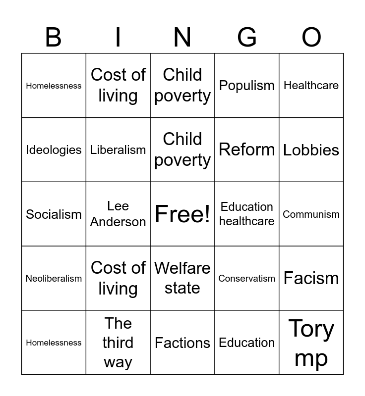 This bingo card has a free space and 24 words: Homelessness, Cost of living, Child poverty, Education, Healthcare, Homelessness, Cost of living, Child poverty, Education healthcare, Communism, Socialism, Liberalism, Conservatism, Facism, Ideologies, The third way, Factions, Populism, Lobbies, Neoliberalism, Lee Anderson, Welfare state, Reform and Tory mp.