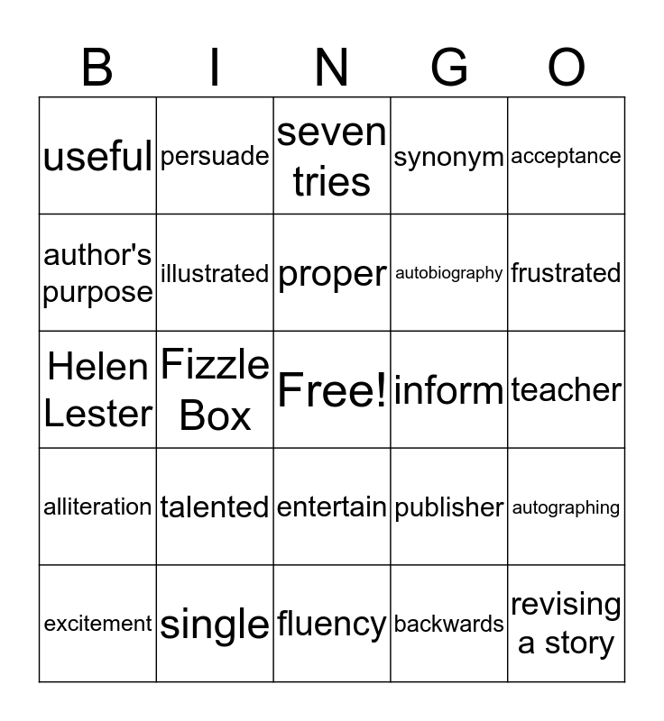 This bingo card has a free space and 24 words: talented, single, proper, excitement, acceptance, useful, author's purpose, persuade, inform, entertain, autobiography, Helen Lester, publisher, autographing, illustrated, backwards, teacher, seven tries, frustrated, Fizzle Box, revising a story, alliteration, synonym and fluency.