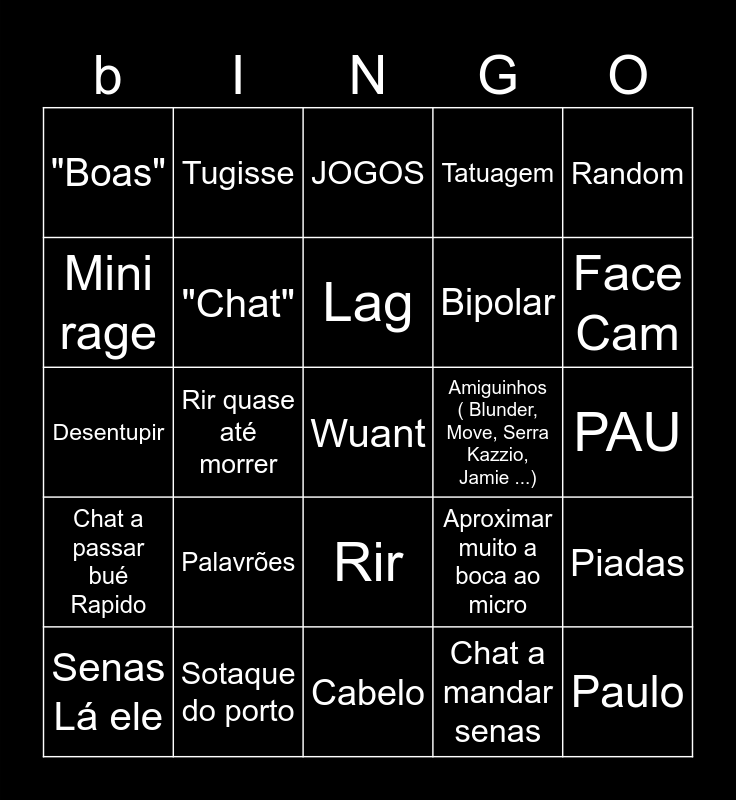 This bingo card has a free space and 24 words: Palavrões, Sotaque do porto, Lag, Senas Lá ele, Random, "Boas", Mini rage, Tugisse, Amiguinhos ( Blunder, Move, Serra Kazzio, Jamie ...), Rir, Bipolar, Desentupir, Aproximar muito a boca ao micro, Piadas, "Chat", Chat a mandar senas, PAU, JOGOS, Face Cam, Rir quase até morrer, Paulo, Chat a passar bué Rapido, Tatuagem and Cabelo.