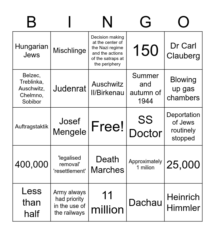 This bingo card has a free space and 47 words: Reinhard Heydrich, Heinrich Himmler, 20 January, 1942, 11 million, 'legalised removal' 'resettlement', Final solution endorsed by a broad segment of the German government, Mischlinge, Operation Reinhard, Belzec, Treblinka, Auschwitz, Chelmno, Sobibor, Carbon Monoxide, Judenrat, 150, 25,000, Approximately 1 milion, Rudolf Hoess, Zyklon B, Auschwitz II/Birkenau, SS Doctor, 20 minutes, Dr Carl Clauberg, Josef Mengele, Dachau, Hungarian Jews, Summer and autumn of 1944, 2 November 1944, Blowing up gas chambers, Less than half, Evacuation, Death Marches, 400,000, 1/3, 40,000, April, 1945, "This is a page of glory in our history that has never been written and that is never to be written", Nazi anti-Semitism and racial policy trumped military imperatives, Army always had priority in the use of the railways, Deportation of Jews routinely stopped, Exigency, Warrior, Forced emigration and expulsion, Germany's defeat in Russia in 1941, Decision making at the center of the Nazi regime and the actions of the satraps at the periphery, Auftragstaktik, Scope for interpretation, 'Bystanders', Greed and Fear of restitution.