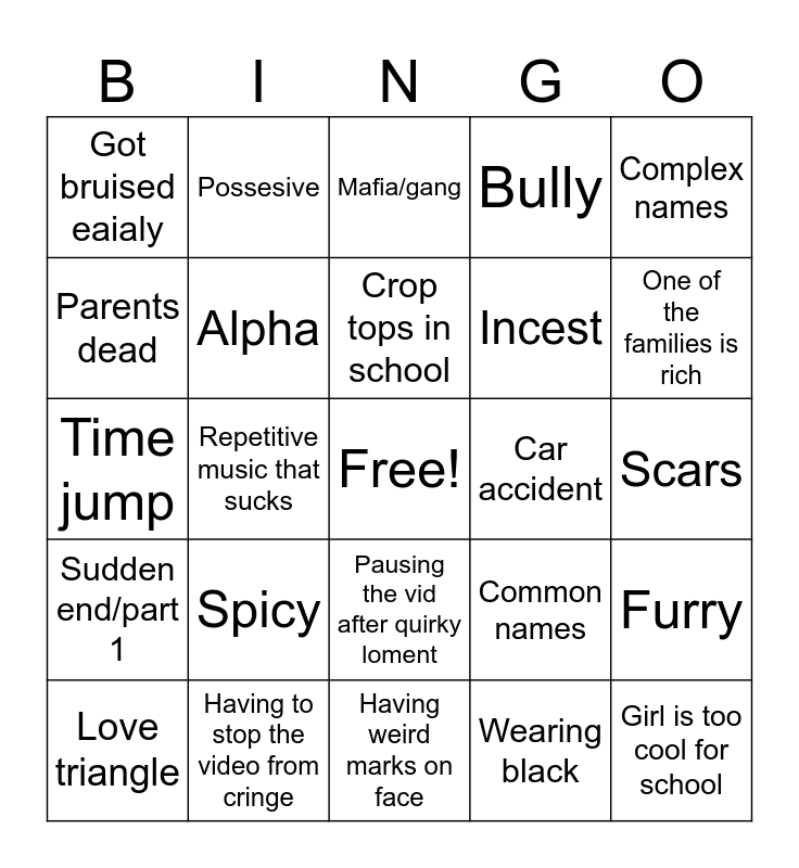 This bingo card has a free space and 28 words: Furry, Cringe, Incest, Wearing black, Parents dead, Mafia/gang, Possesive, Sudden end/part 1, Car accident, Love triangle, Time jump, Bully, Having to stop the video from cringe, Having weird marks on face, One of the families is rich, Slowwalking, Spicy, Alpha, Crop tops in school, Pausing the vid after quirky loment, Got bruised eaialy, The boy is wearing sunglasses, Girl is too cool for school, Repetitive music that sucks, Scars, Common names, Complex names and Weird eye colors or hair.
