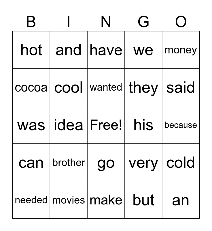 This bingo card has a free space and 24 words: brother, movies, wanted, needed, money, hot, cocoa, and, his, go, they, was, very, cold, cool, but, because, have, said, idea, an, can, we and make.