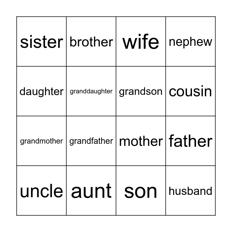 This bingo card has 19 words: mother, grandmother, wife, husband, father, daughter, son, sister, brother, grandmother, grandfather, granddaughter, grandson, aunt, uncle, niece, nephew, cousin and family.