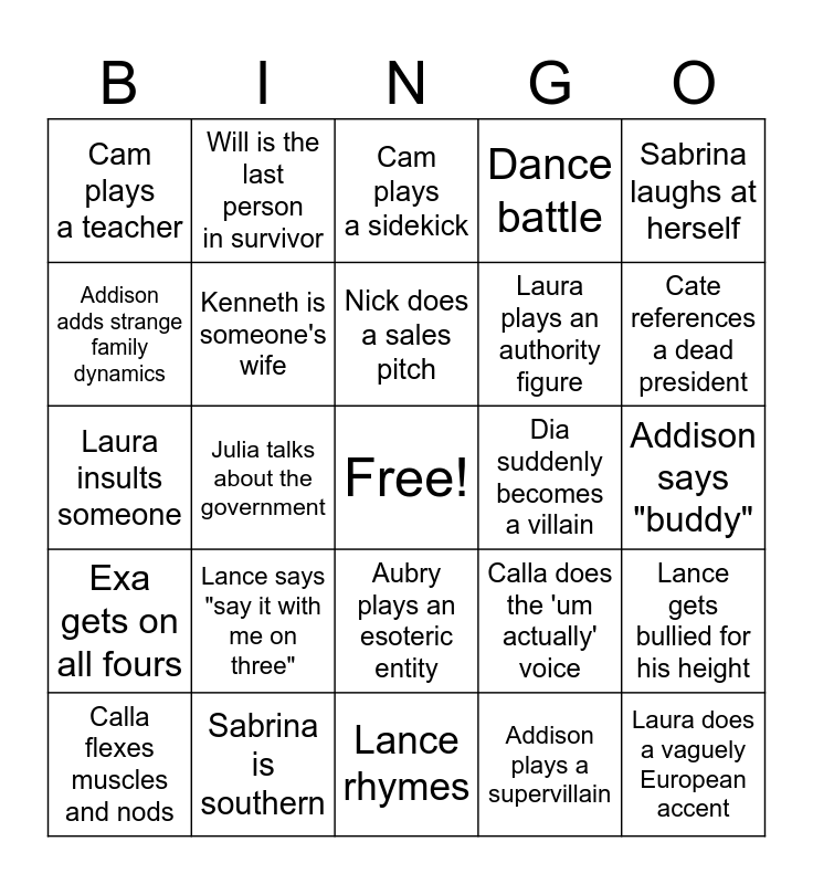 This bingo card has a free space and 39 words: Nick stomps, Ernesto says "girl... okay.", Hudson dies/is already dead, Kenneth is someone's wife, Calla flexes muscles and nods, Aubry plays an esoteric entity, Nick does a sales pitch, Will does a crazy accent, Sabrina laughs at herself, Exa gets on all fours, Julia talks about the government, Dance battle, Laura does a vaguely European accent, Addison says "buddy", Dia suddenly becomes a villain, Lance says "say it with me on three", Neko starts crying, Cam plays a teacher, Will does a little jig, Calla does the 'um actually' voice, Addison adds strange family dynamics, Lance rhymes, Laura plays an authority figure, Cate references a dead president, Someone falls off their chair in the back, Kenneth says "I was an honest man, once", Cam gives sage advice, Someone plots a coup d'état, Aubry goes "wait, I'm [inset accent]", Will is the last person in survivor, Someone breaks character, Exa plays a child, Cam plays a sidekick, Sabrina is southern, Addison plays a supervillain, Will yells and/or screams, Lance gets bullied for his height, Laura insults someone and Julia reveals a master plan.