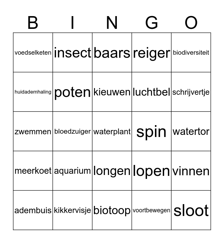 This bingo card has 25 words: aquarium, biotoop, kieuwen, adembuis, biodiversiteit, voedselketen, huidademhaling, insect, spin, longen, luchtbel, zwemmen, lopen, vinnen, poten, sloot, watertor, baars, schrijvertje, bloedzuiger, waterplant, kikkervisje, meerkoet, reiger and voortbewegen.