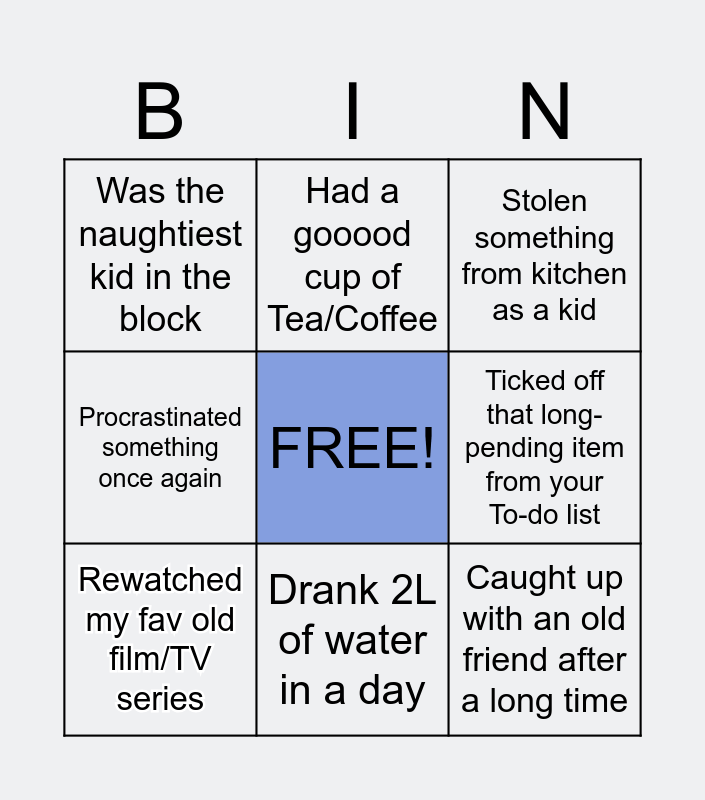 This bingo card has a free space and 10 words: Rewatched my fav old film/TV series, Drank 2L of water in a day, Stolen something from kitchen as a kid, Was the naughtiest kid in the block, Ticked off that long-pending item from your To-do list, Procrastinated something once again, Had a gooood cup of Tea/Coffee, Caught up with an old friend after a long time, Spontaneous Grocery Shopping and Spent a day without screens.