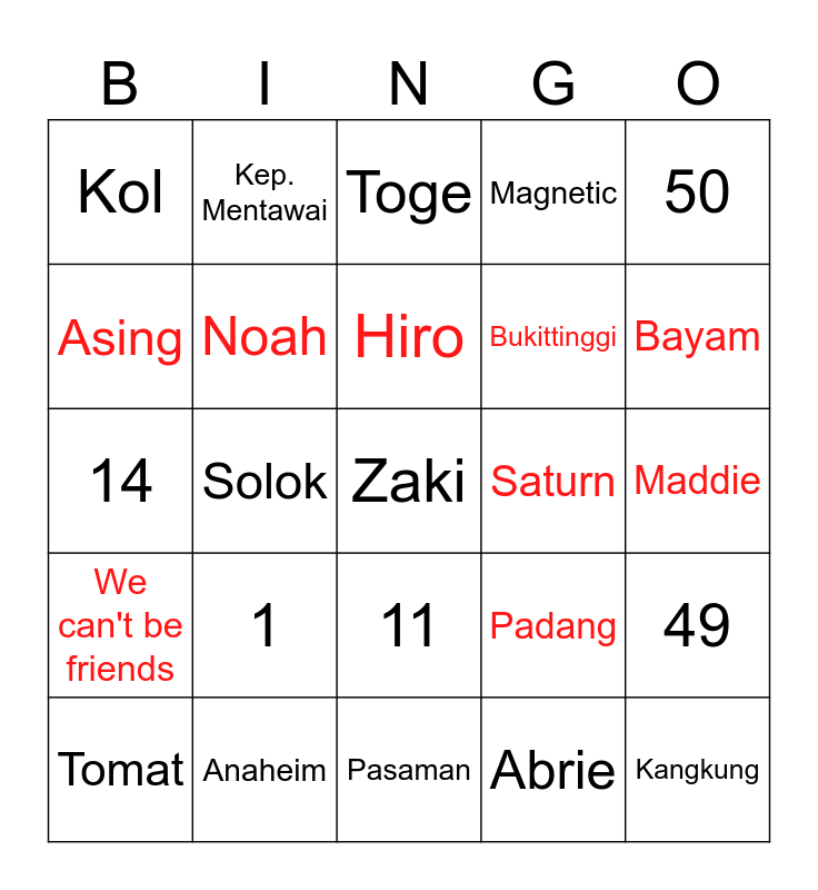 This bingo card has 25 words: 1, Pasaman, Hiro, Tomat, 50, Kol, Asing, Kep. Mentawai, Saturn, 11, Bukittinggi, 14, Padang, 49, Noah, Kangkung, Maddie, Toge, Bayam, Solok, Zaki, Anaheim, We can't be friends, Magnetic and Abrie.