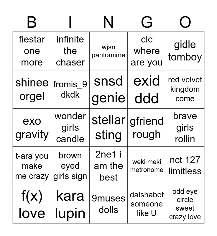 This bingo card has 25 words: brown eyed girls sign, 9muses dolls, snsd genie, f(x) love, gidle tomboy, fiestar one more, shinee orgel, infinite the chaser, gfriend rough, 2ne1 i am the best, exid ddd, exo gravity, weki meki metronome, nct 127 limitless, fromis_9 dkdk, odd eye circle sweet crazy love, brave girls rollin, wjsn pantomime, red velvet kingdom come, wonder girls candle, stellar sting, kara lupin, t-ara you make me crazy, clc where are you and dalshabet someone like U.