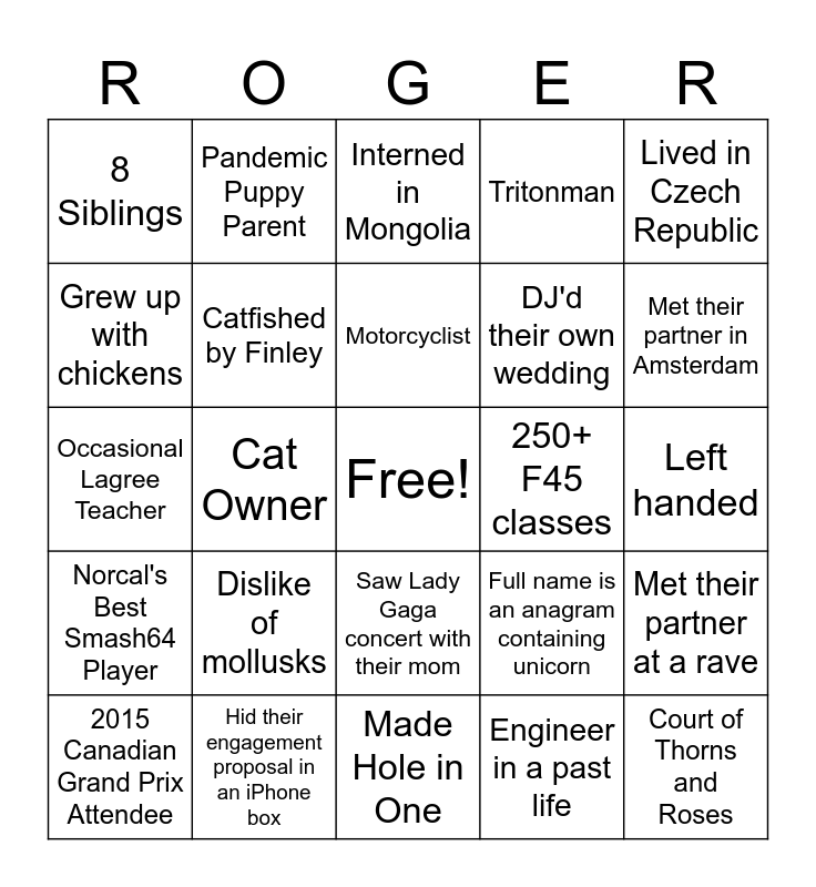 This bingo card has a free space and 24 words: Dislike of mollusks, Hid their engagement proposal in an iPhone box, Motorcyclist, 2015 Canadian Grand Prix Attendee, Lived in Czech Republic, 8 Siblings, Grew up with chickens, Pandemic Puppy Parent, 250+ F45 classes, Saw Lady Gaga concert with their mom, DJ'd their own wedding, Occasional Lagree Teacher, Full name is an anagram containing unicorn, Met their partner at a rave, Catfished by Finley, Engineer in a past life, Left handed, Interned in Mongolia, Met their partner in Amsterdam, Cat Owner, Court of Thorns and Roses, Norcal's Best Smash64 Player, Tritonman and Made Hole in One.