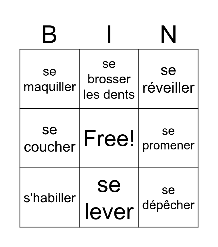This bingo card has a free space and 13 words: s'amuser, s'asseoir, s'habiller, se brosser les dents, se coucher, se dépêcher, se doucher, se laver, se lever, se maquiller, se promener, se réveiller and se tromper.