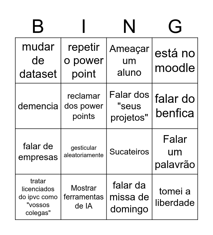 This bingo card has 23 words: tomei a liberdade, dito isto, falar do benfica, falar do porto, demencia, mudar de dataset, reclamar dos power points, repetir o power point, tratar licenciados do ipvc como "vossos colegas", piada seca, gesticular aleatoriamente, falar de empresas, mencionar 10 euros, "Vamos aguardar", Mostrar ferramentas de IA, Sentar e levantar logo de seguida, Ameaçar um aluno, Sucateiros, Falar dos "seus projetos", Falar um palavrão, está no moodle, falar da missa de domingo and desenhar no quadro.