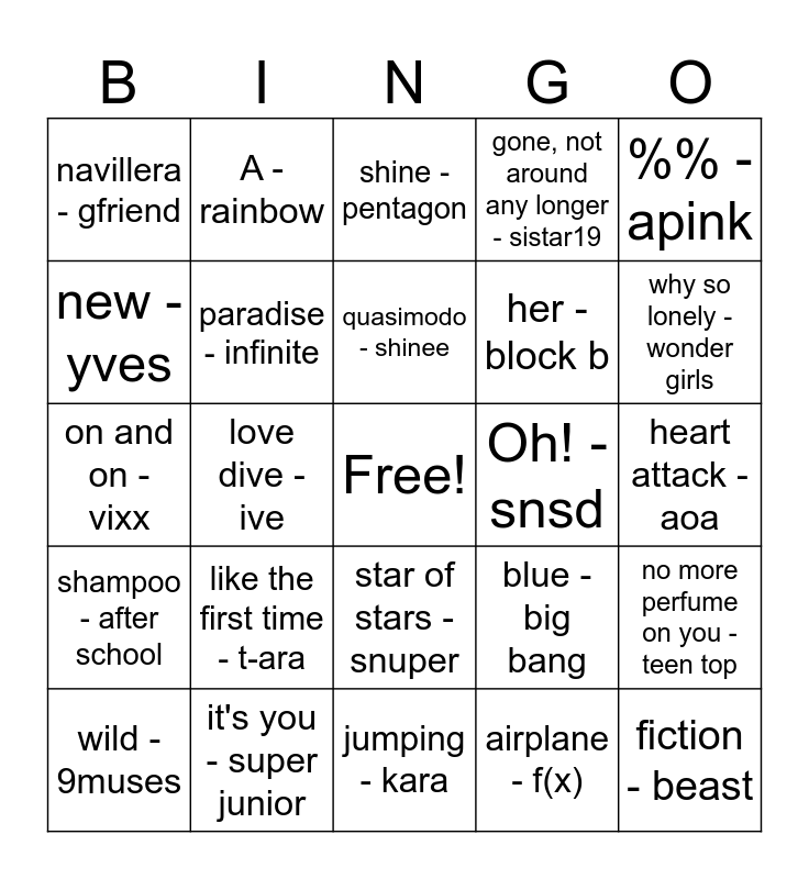 This bingo card has a free space and 24 words: like the first time - t-ara, it's you - super junior, quasimodo - shinee, wild - 9muses, %% - apink, navillera - gfriend, new - yves, A - rainbow, Oh! - snsd, star of stars - snuper, her - block b, on and on - vixx, blue - big bang, no more perfume on you - teen top, paradise - infinite, airplane - f(x), heart attack - aoa, shine - pentagon, why so lonely - wonder girls, love dive - ive, fiction - beast, shampoo - after school, gone, not around any longer - sistar19 and jumping - kara.