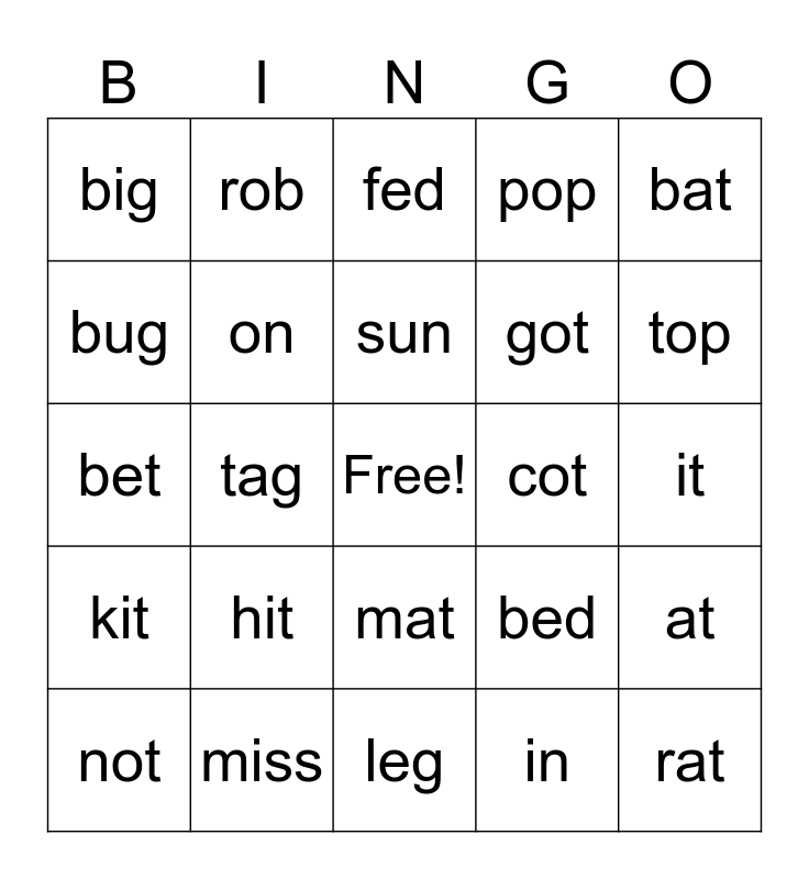 This bingo card has a free space and 24 words: hit, miss, sun, not, bat, big, bug, rob, cot, mat, got, bet, bed, at, on, in, it, fed, top, tag, rat, kit, pop and leg.