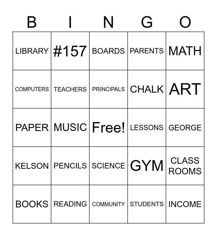 This bingo card has a free space and 24 words: PENCILS, READING, PRINCIPALS, BOOKS, MATH, LIBRARY, COMPUTERS, #157, LESSONS, SCIENCE, CHALK, PAPER, GYM, CLASS ROOMS, TEACHERS, STUDENTS, GEORGE, BOARDS, ART, MUSIC, INCOME, KELSON, PARENTS and COMMUNITY.