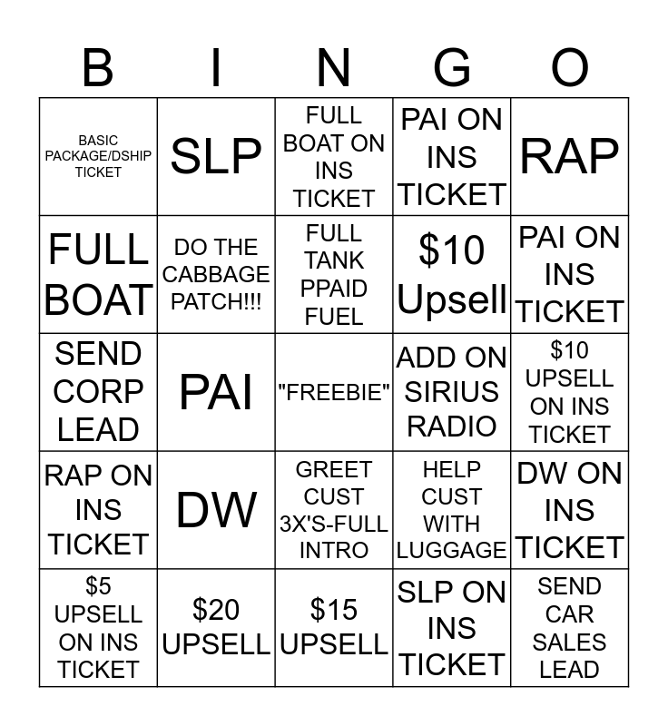 This bingo card has a free space and 24 words: DW, $20 UPSELL, FULL TANK PPAID FUEL, $5 UPSELL ON INS TICKET, RAP, BASIC PACKAGE/DSHIP TICKET, FULL BOAT, SLP, ADD ON SIRIUS RADIO, GREET CUST 3X'S-FULL INTRO, $10 Upsell, SEND CORP LEAD, HELP CUST WITH LUGGAGE, DW ON INS TICKET, DO THE CABBAGE PATCH!!!, SLP ON INS TICKET, $10 UPSELL ON INS TICKET, FULL BOAT ON INS TICKET, PAI ON INS TICKET, PAI, SEND CAR SALES LEAD, RAP ON INS TICKET, PAI ON INS TICKET and $15 UPSELL.