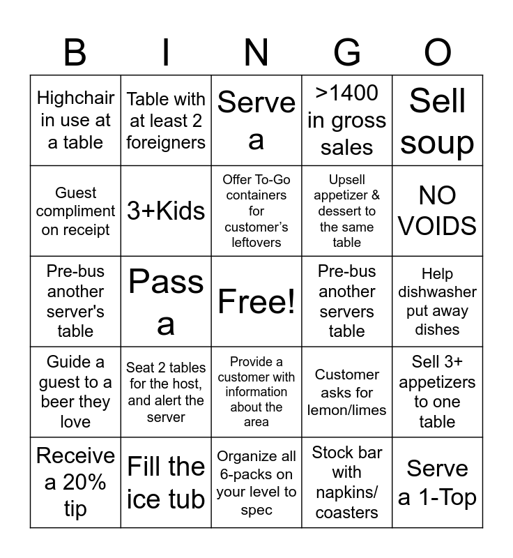 This bingo card has a free space and 85 words: Sell a bottle of Orin Swift, (Machete or 8 years), Serve a, Upsell a bottle of wine, Guest compliment to the Host upon leaving, No COMPS all shift, Ask a manager for help, Sell a Beer from the Specials Menu, Gluten Free Guest, Use a Tray all Shift, Answer the phone when host is away, Run another Server's Food, 3+Kids, Pre-bus another servers table, Run another server's drinks, Highchair in use at a table, Receive a 20% tip, Guest compliment on receipt, Sell a bottle of Bold & Delaney, No VOIDS, Sell 3+Mocktails all day, Upsell appetizer & dessert to the same table, Serve a 1-Top, PASSED OFF ON WINE SERVICE, Pass a, Get a round of drinks for our kitchen warriors, Upsell coffee/ espresso with dessert, Consistently pre-bus to just cups *busser verified*, Stock ice cream in the server freezer, Polish a full rack of cups/barware to perfection, Seat 2 tables for the host, and alert the server, Run another Server's Food, Offer to pour each beer you serve, Pre-bus another server's table, Run another server's drinks, Offer cracked pepper, Organize all 6-packs on your level to spec, Sort a tray of silverware solo, Guide a guest to a beer they love, NO VOIDS, Sell 3+Mocktails all day, Upsell appetizer & dessert to the same table, Sell 3+ specialty cocktails all day, 6-pack to every table BEFORE apps arrive, Sell a drink with higher tier liquor (no well liquor), Clock-in +5 minutes early, Stock the host stand with roll ups, Work on the monthly sidework, Dairy free guest, Take out a full linens or kitchen trash bag, Table with at least 2 foreigners, Offer To-Go containers for customer’s leftovers, Sell a pitcher of beer, Sell 3+ short rib pastas, A guest with infant/ toddler, Carry a full tray for a busser, Fill the ice tub, >1400 in gross sales, Have a bank with at least 20 $1 bills, Clean windows/ patio floor, Refill a table’s soda drinks, >60 personal covers in a shift, Make new six packs, Sell a dessert cocktail, Sell a cherry coke, Sell soup, Greet a table with water within 30 seconds, Sell 3+ appetizers to one table, Fully bus and wipe +3 tables, Vegan guest, Sell one table a wine, a beer, and a cocktail, Table with at least 4 non-alcohol $ drinks, Sell 2+ salmon entrees, Sell 5+ specials menu items, Provide a table that isn’t yours with a six pack, Provide a customer with information about the area, Stock bar with napkins/ coasters, Sell a +$12 cocktail, Offer creamer to a guest that orders coffee, Sell 3 different kinds of margaritas, Help dishwasher put away dishes, Sell an +$20 entree, Run another server’s food/drinks 5 times, Customer asks for lemon/limes and Table asks for bbq sauce/ranch.