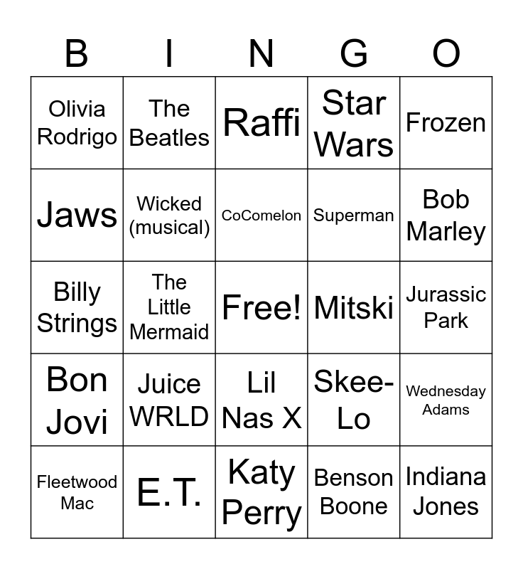This bingo card has a free space and 32 words: Benson Boone, Imagine Dragons, The Little Mermaid, Ark Patrol, Bon Jovi, Wicked (musical), Frozen, Wednesday Adams, The Beatles, Baby Shark, CoComelon, Raffi, Eminem, Kanye West, Mitski, Taylor Swift, Fleetwood Mac, Billy Strings, Lil Nas X, Juice WRLD, Skee-Lo, Harry Potter, Jurassic Park, E.T., Indiana Jones, Star Wars, Superman, Jaws, Olivia Rodrigo, Katy Perry, Queen and Bob Marley.
