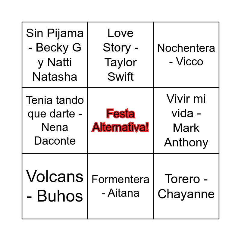 This bingo card has a free space and 34 words: Salir - Extremoduro, SOS - Abba, Looking for paradise - Alejandro Sanz, Dos hombres y un destino - Bustamante y Alex, La canción del velero - La fiesta, Volcans - Buhos, Torero - Chayanne, Boig per tu - Sau, Love Story - Taylor Swift, Sarà perché ti amo - Richi e Poveri, Formentera - Aitana, Nochentera - Vicco, Salta - Tequila, A quien le importa - Alaska, Me gustas tu - Manu Chao, Soldadito Marinero - Fito, Mi gran noche - Raphael, Yo quiero bailar - Sonia y Selena, Wannabe - SpiceGirls, Zombie - The Cranberries, Zorra - Nebulossa, Noche de sexo - Wisin y Yandel, Sin Pijama - Becky G y Natti Natasha, Felices los 4 - Maluma, Física o Química - Despistaos, 20 de enero - La oreja de Van Gogh, Tenia tando que darte - Nena Daconte, Para no verte más - La mosca tsé tsé, Aserejé - Las Ketchup, Vivir mi vida - Mark Anthony, Cuéntame un cuento - Celtas Cortos, Dime - Beth, Mentirosa - Ráfaga and Diabla - Mushka y Figa Flawas.