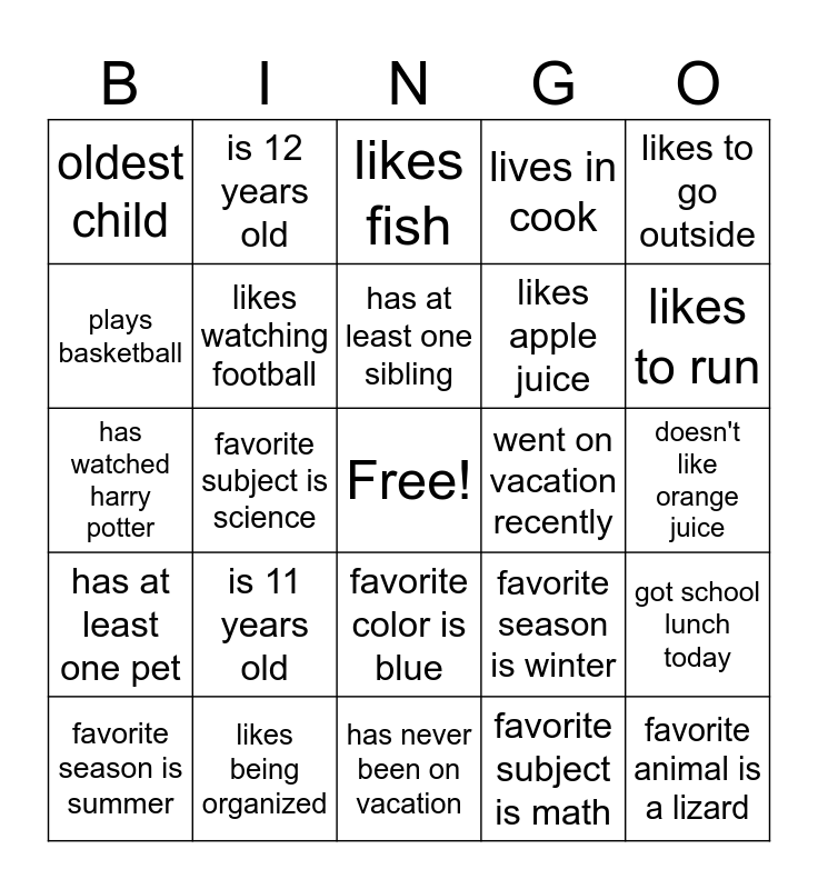 This bingo card has a free space and 35 words: likes country music, is wearing pink, favorite food is pizza, likes watching football, favorite color is blue, lives in cook, plays basketball, packed a lunch today, has at least one sibling, likes broccoli, has watched harry potter, likes to go outside, youngest child, middle child, oldest child, went on vacation recently, favorite subject is math, favorite subject is science, has at least one pet, favorite animal is a lizard, favorite season is winter, favorite season is summer, got school lunch today, likes being organized, likes fish, likes to run, prefers cold weather, prefers hot weather, likes apple juice, doesn't like orange juice, likes reading, has never been on vacation, is 11 years old, is 12 years old and favorite ice cream is chocolate.